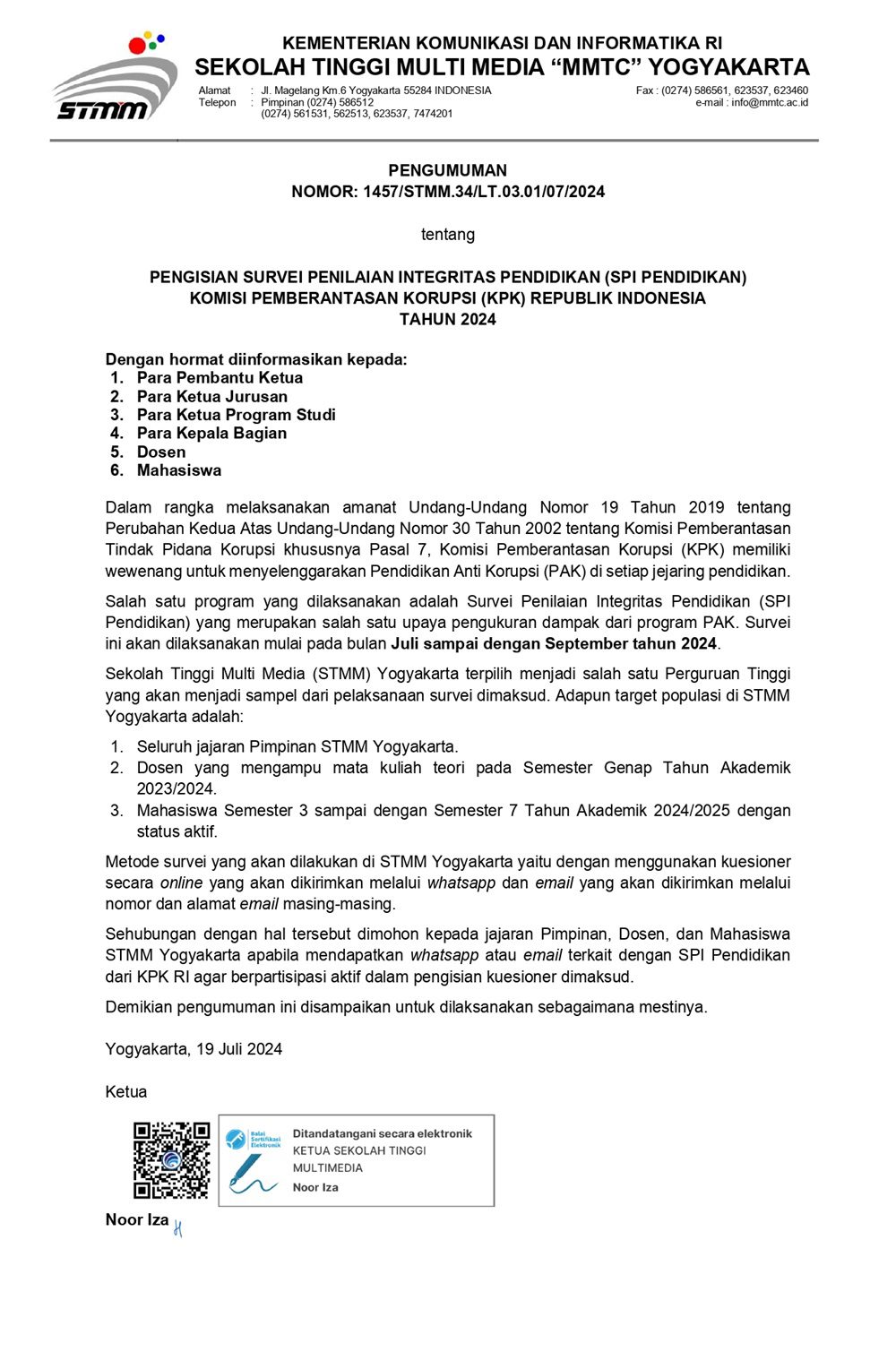 Pengumuman Mahasiswa PENGISIAN SURVEI PENILAIAN INTEGRITAS PENDIDIKAN (SPI PENDIDIKAN) KOMISI PEMBERANTASAN KORUPSI (KPK) REPUBLIK INDONESIA TAHUN 2024