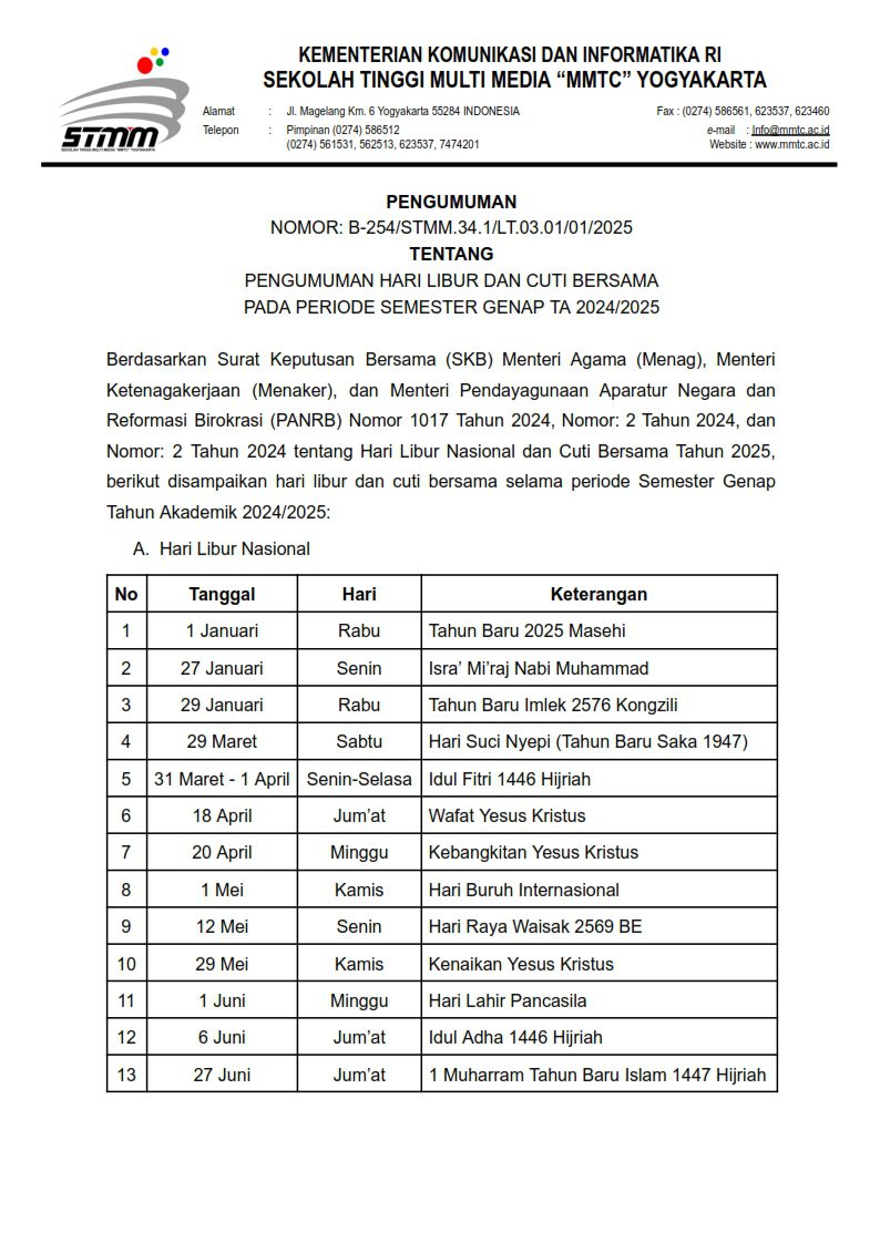 Tidak ada gambar Pengumuman Umum Pengumuman Pendaftaran Asrama Mahasiswa Sekolah Tinggi Multi Media Periode 2 Tahun 2025