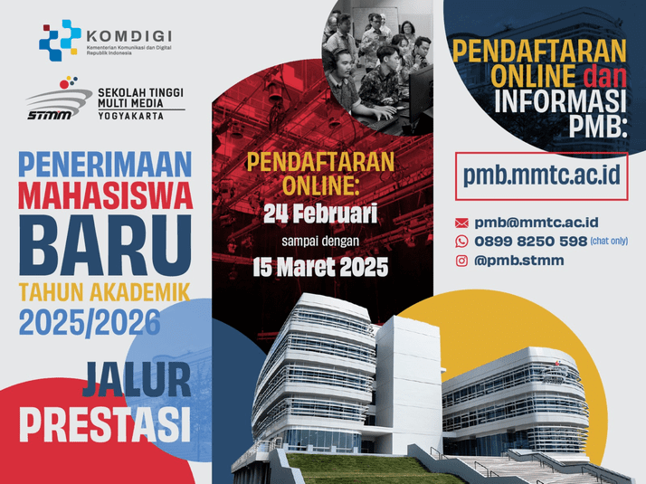 Yogyakarta, 24 Februari 2025 – Sekolah Tinggi Multi Media (STMM) yang saat ini sedang dalam proses peralihan menuju Politeknik Digital, membuka pendaftaran mahasiswa baru (PMB) mulai tanggal 24 Februari 2025. Terdapat 3 (tiga) jalur pendaftaran dan seleksi yang dapat diikuti oleh calon mahasiswa, yaitu Jalur Seleksi Prestasi, Jalur Seleksi CBT (Computer Based Test), serta Jalur Seleksi Berbasis Skor UTBK.Jalur seleksi prestasi adalah yang pertama kali dibuka. Persyaratan pendaftaran jalur prestasi yaitu: nilai rapor selama 5 (lima) semester, sertifikat prestasi, dan portofolio karya yang pernah diraih. Jalur seleksi yang akan dibuka selanjutnya adalah Jalur Seleksi CBT yang akan dilaksanakan secara online dan onsite di beberapa kota di Indonesia. Bekerjasama dengan satuan kerja di lingkungan Kementerian Komunikasi dan Digital (Komdigi), ujian CBT akan dilaksanakan di Yogyakarta, Medan, Jakarta, Bandung, Banjarmasin, Makassar, dan Surabaya. Sementara untuk ujian CBT secara online akan disediakan secara terbatas khusus untuk calon mahasiswa berdomisili jauh dari lokasi yang disediakan.Tahun ini, untuk pertama kalinya STMM membuka seleksi PMB berbasis skor UTBK. Jalur seleksi Skor UTBK merupakan jalur pendaftaran terakhir PMB STMM 2025. Sebagai syarat pendaftaran, calon mahasiswa harus memiliki sertifikat skor UTBK yang dilaksanakan pada tahun 2025.STMM memiliki 3 (tiga) jurusan yaitu Penyiaran, Animasi dan Teknologi Permainan, serta Komunikasi Informasi Publik. Dari tiga jurusan, ada 6 Program Studi yang ditawarkan yaitu: Manajemen Informasi dan Komunikasi (jenjang Sarjana/Strata-I), serta 5 (lima) program studi jenjang Sarjana Terapan (Diploma-IV) yaitu Manajemen Produksi Siaran, Manajemen Produksi Berita, Manajemen Teknik Studio Produksi, Animasi, dan Teknologi Permainan. Seluruh mahasiswa STMM juga akan mendapatkan berbagai pelatihan untuk menunjang kompetensi dan meningkatkan keterampilan melalui program Digital Talent Scholarship (DTS) dari Kementerian Komdigi.Informasi lebih lanjut mengenai persyaratan pendaftaran, alur seleksi, dan jadwal pelaksanaan PMB STMM 2025 dapat diakses melalui www.pmb.mmtc.ac.id, e-mail pmb@mmtc.ac.id, media sosial Instagram @pmb.stmm, dan hotline Whatsapp 08998250598.