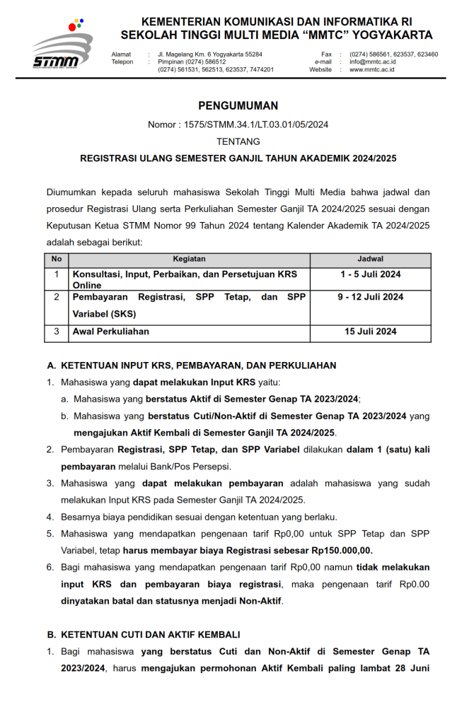 Pengumuman Registrasi Ulang Semester Ganjil Tahun Akademik 2024/2025