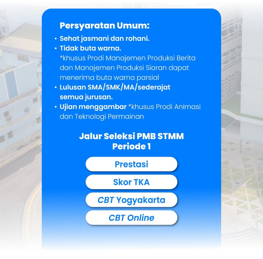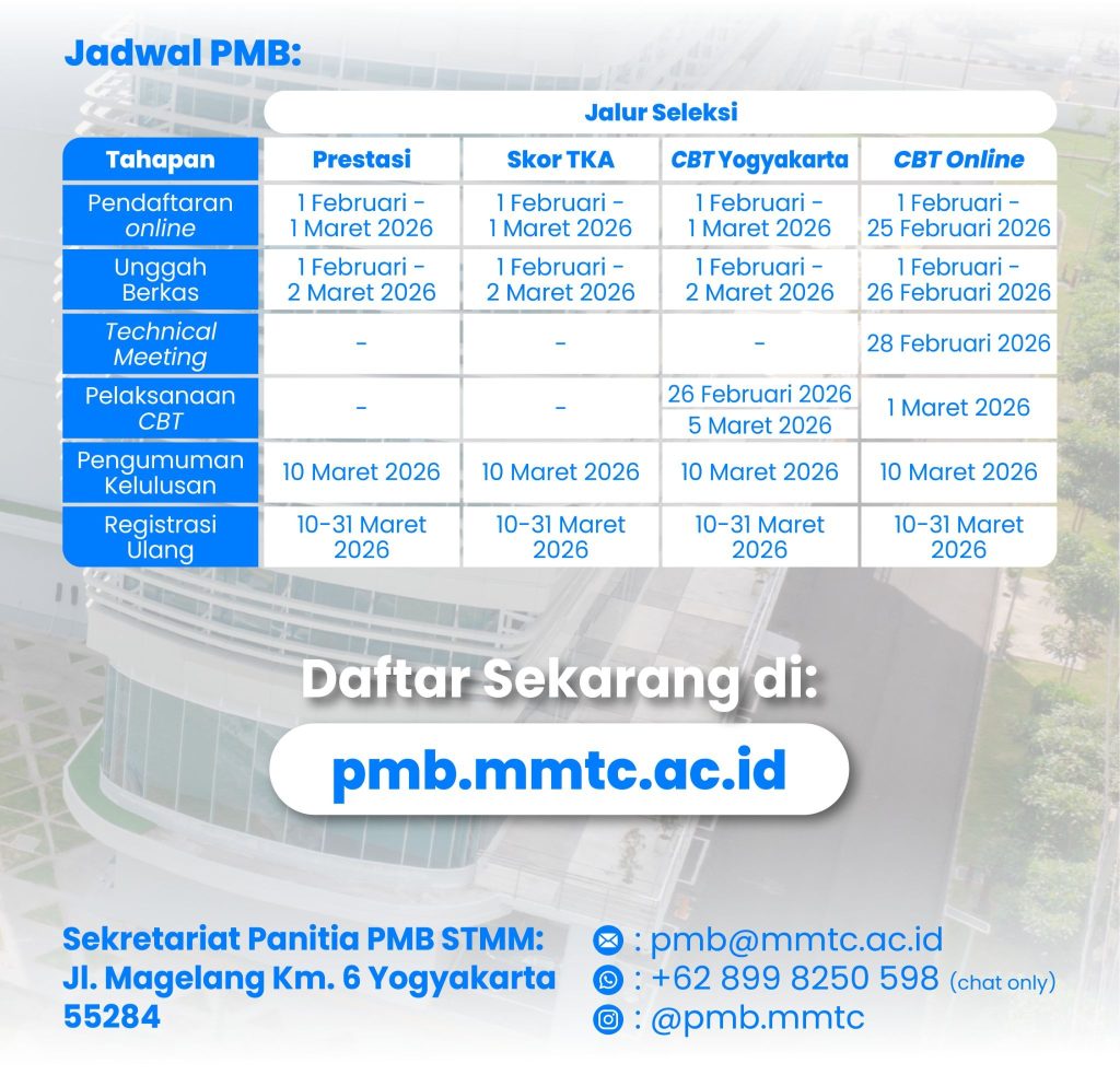 Yogyakarta, 1 Februari 2026 – Sekolah Tinggi Multi Media (STMM) merupakan Perguruan Tinggi Negeri non-ikatan dinas di bawah naungan Kementerian Komunikasi dan Digital RI, membuka pendaftaran Penerimaan Mahasiswa Baru (PMB) Tahun Akademik 2026/2027 Periode 1 pada 1 Februari 2026. Calon pendaftar PMB STMM 2026 dapat mengakses informasi dan pendaftaran melalui laman pmb.mmtc.ac.id