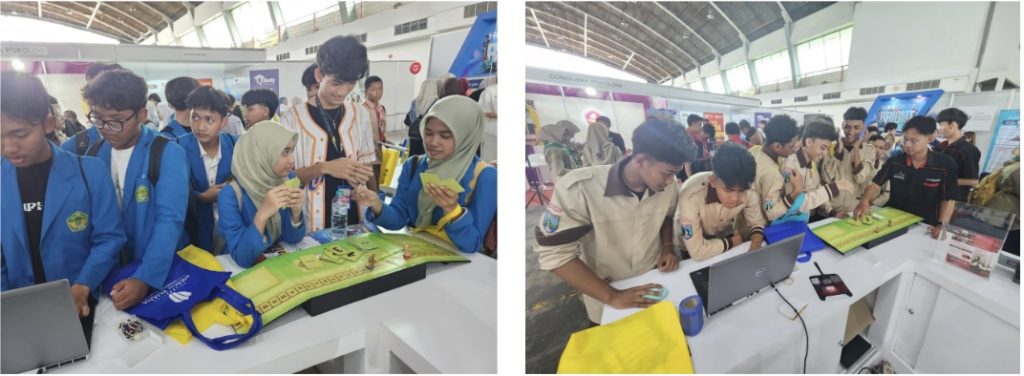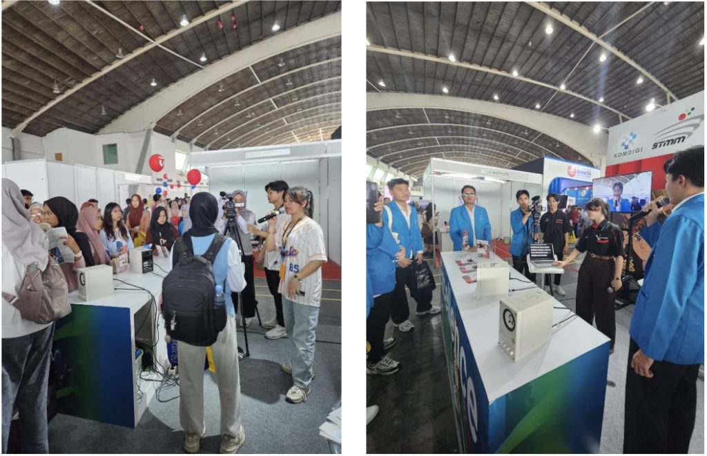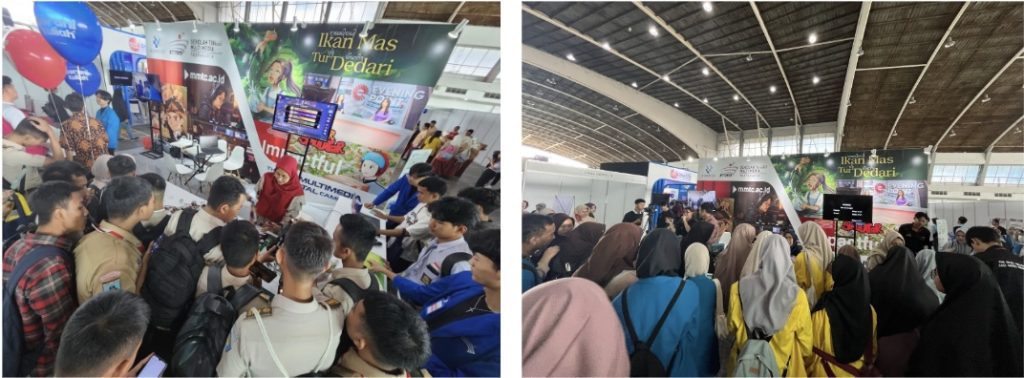 Tim Humas STMM bersama mahasiswa Berlian (prodi Manarita), Amry (prodi Matekstosi), Aka Shakthi (prodi Teknologi Permainan), Vivo (prodi MIK) menyampaikan informasi mengenai profil STMM, profil program studi, fasilitas pendukung akademik yang ada di STMM, informasi PMB, beasiswa, pelatihan, maupun sertifikasi LSP STMM kepada pengunjung pameran. Aka Shakthi (prodi TP) menampilkan beberapa karya gim mahasiswa seperti Kurir Paket Simulator dan Jiwa, The Damned Soul. Pengunjung antusias memainkan berbagai gim karya mahasiswa STMM. Selain karya gim, film animasi “Ikan Mas tur Dedari” juga turut ditampilkan di IIETE 2025. Berlian dan Amry menampilkan kegiatan simulasi penyiaran untuk pengunjung yang ingin mencoba menjadi reporter berita maupun camera person.