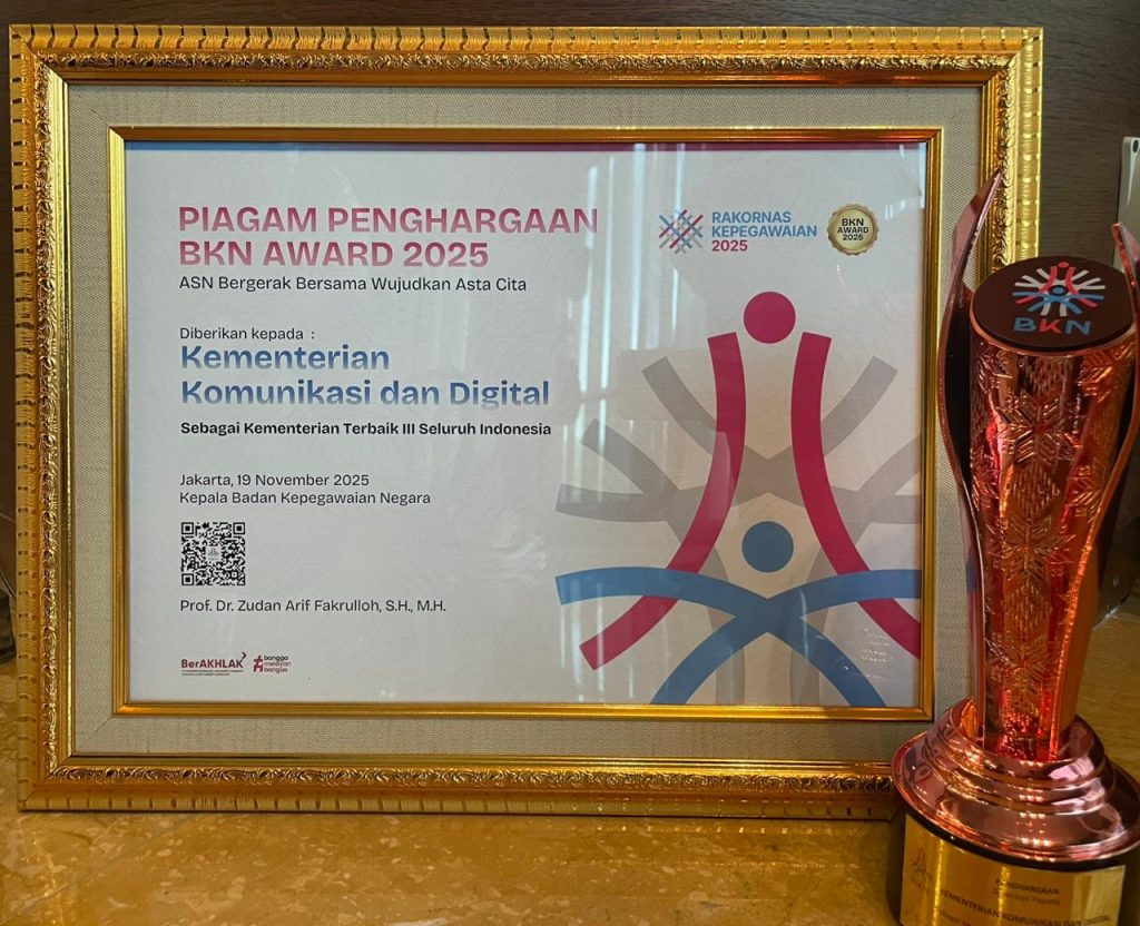 Kementerian Komunikasi dan Digital mendapatkan penghargaan sebagai Kementerian Terbaik III Seluruh Indonesia dalam BKN Award 2025.